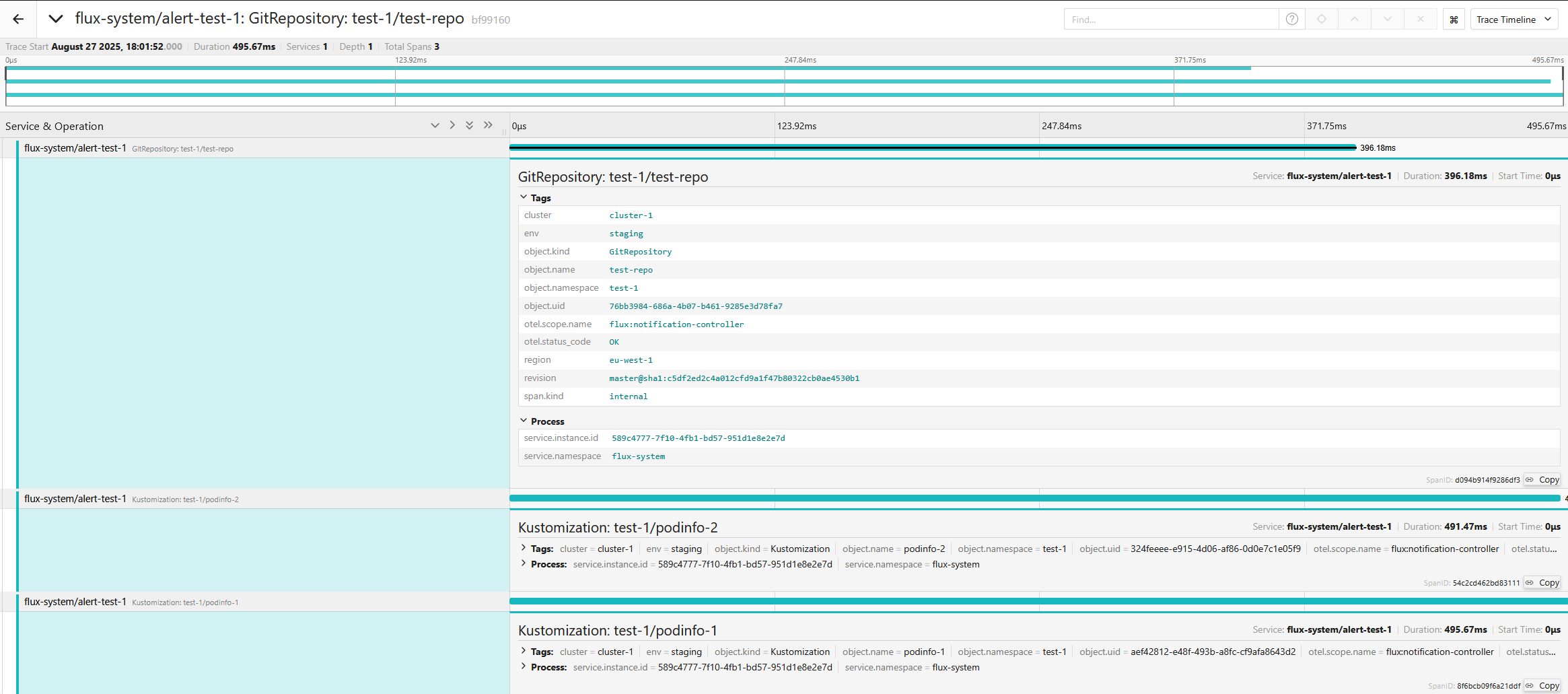 The notification-controller converts Flux events into OTEL spans with proper trace relationships